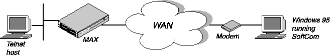 In Figure 6-1, a PC running SoftComm initiates an incoming modem call. The MAX directs the call to its digital modems, and then forwards the call to its terminal server software. In Figure 6-1, the MAX immediately directs the call to a Telnet host.